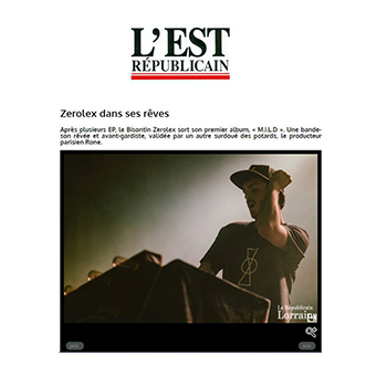 « Après plusieurs EP, le Bisontin Zerolex sort son premier album, « M.I.L.D ». Une bande-son rêvée et avant-gardiste, validée par un autre surdoué des potards, le producteur parisien Rone. » – L’Est Républicain