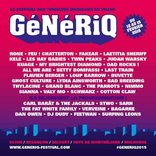 Cinq agglos, cinq salles de concert et un festival complices et amis et… GéNéRiQ ! Les tumultes musicaux débarquent en ville avec un oeil nouveau et GéNéRiQ 2015 se recentre sur ce qu’il fait de mieux : des concerts inattendus au plus près des habitants…